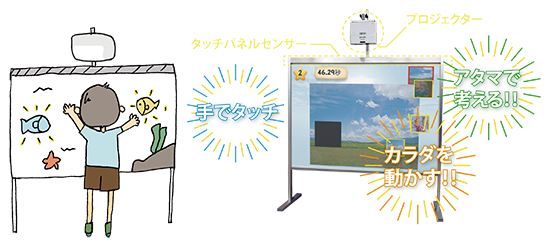 PROJESTUREという大画面タッチパネルを導入し、認知アセスメントや集団トレーニングに使用しています。全身を使って、アタマで考えて、楽しみながら学べる環境を提供していきます。